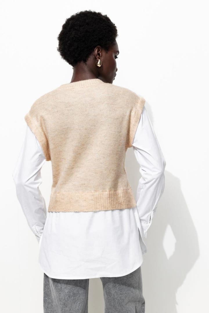 New collection Une fausse chemise en popeline de coton rencontre un pull torsadé sans manches : on applaudit cet effet 2 en 1, pile dans la tendance superposition ! A associer à un legging, un pantalon cigarette, un jean… Maille douce et moelleuse, torsades devant, col rond côtelé, emmanchures américaines. Manches longues, poignets boutonnés et base arrondie fendue sur les côtés, finition piquée ton sur ton.